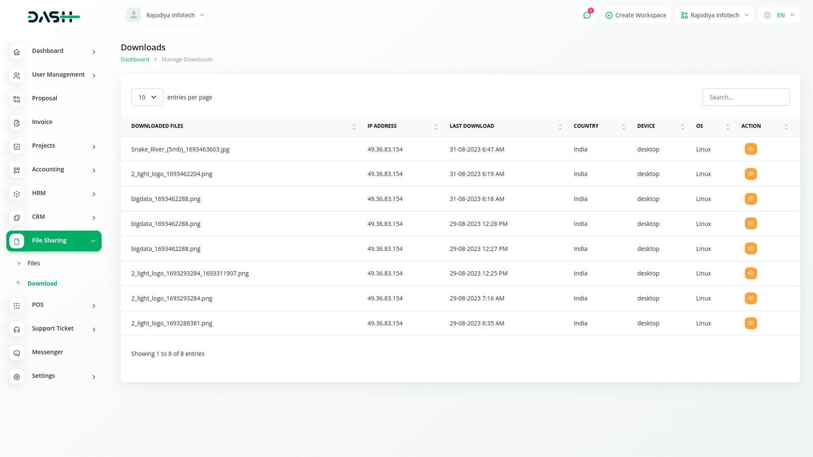 In file download management, you can know and view file name, IP address, date, country, device, OS etc. when a file is downloaded.