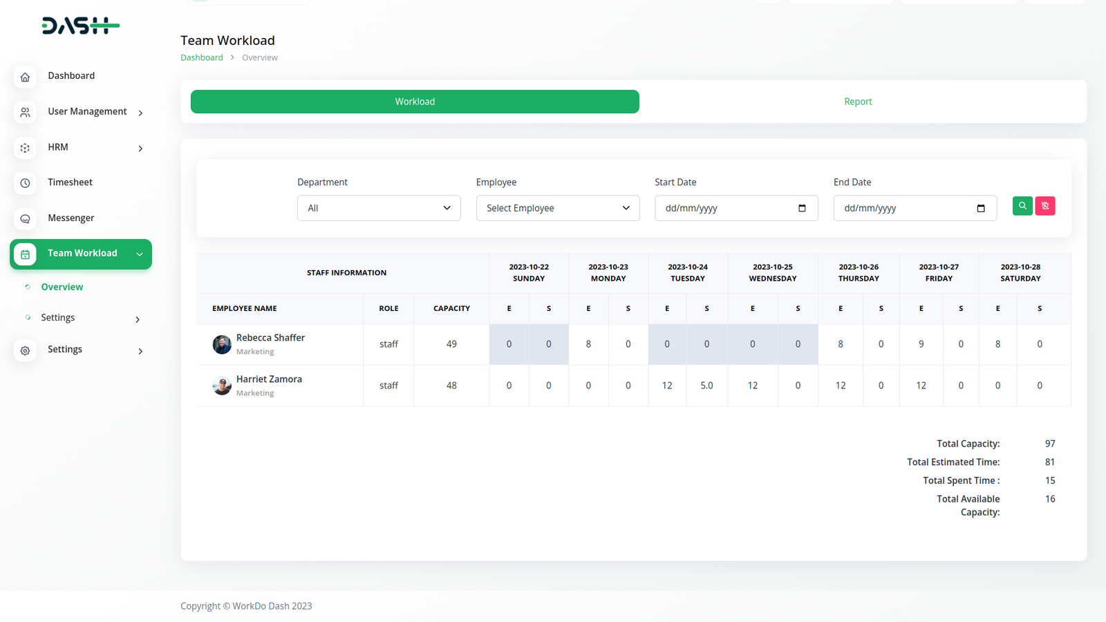 With the Team Workload module, we can find out the total number of hours an employee has the ability to work in a week and the total number of hours worked in these occupations.