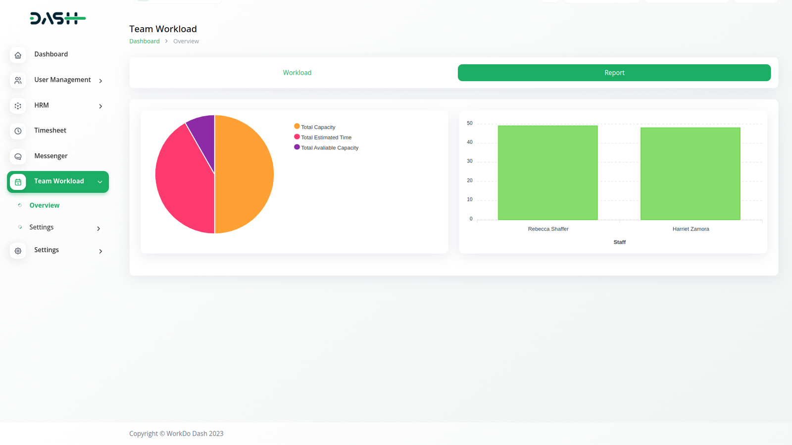 Team Workload report provides total capacity ,total estimated time and total avaliable capacity and also you can show particular users Total Capcity Hours in using this report.