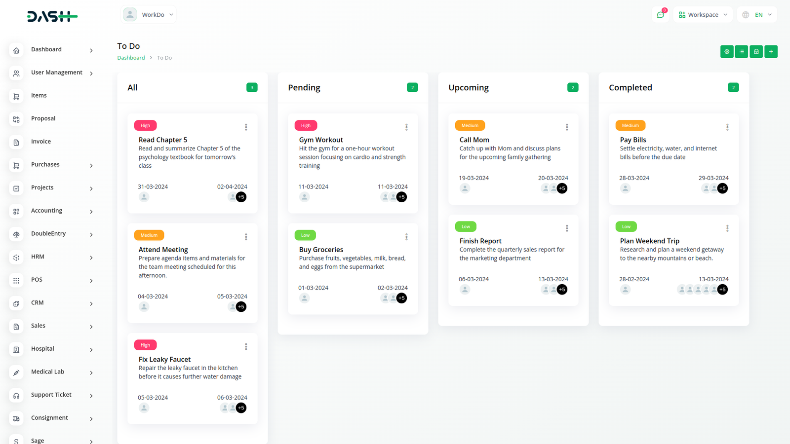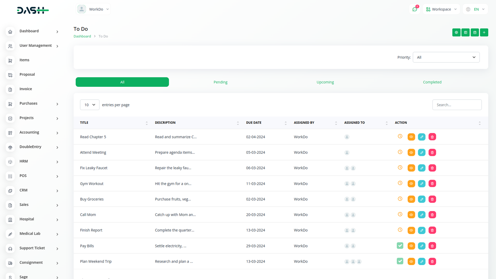 Simplify task management with Dash SaaS's ToDo module. Create, assign, and track tasks seamlessly, customizing stages to monitor progress effectively. From ideation to completion, streamline your workflow and ensure tasks are completed on time with intuitive tools that prioritize efficiency.