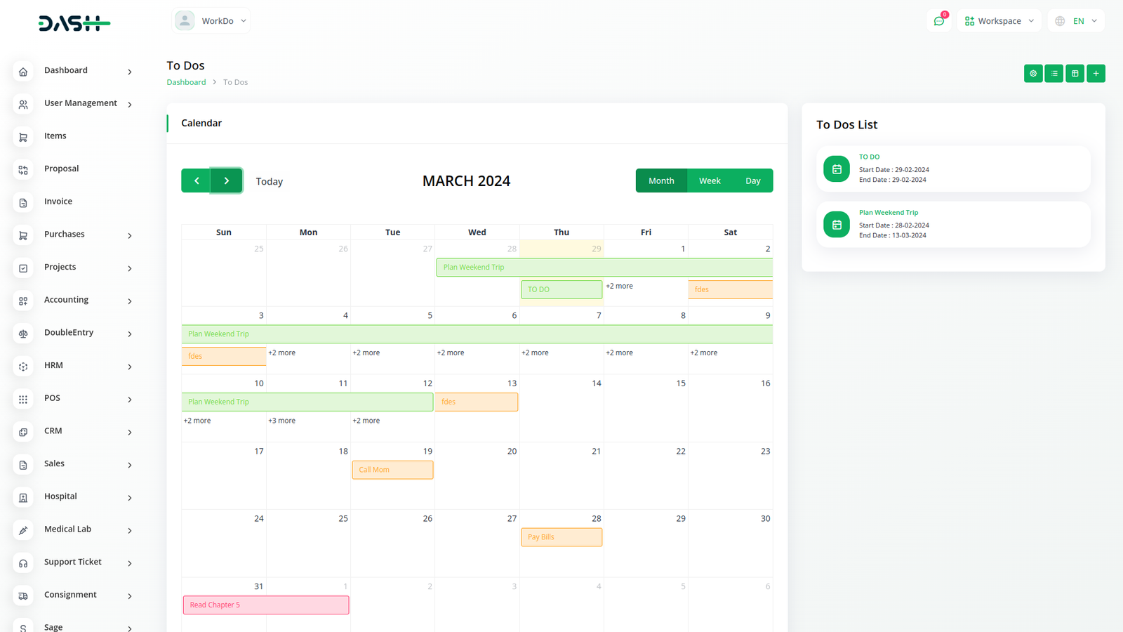 Visualize your tasks and appointments with the calendar view feature in Dash SaaS's ToDo module. Plan your schedule effectively by seeing tasks alongside meetings and deadlines in a comprehensive calendar layout. With this intuitive visualization tool, manage your time efficiently and prioritize tasks based on their due dates and importance. Stay organized and on top of your commitments with Dash SaaS's seamless integration of task management and scheduling capabilities.