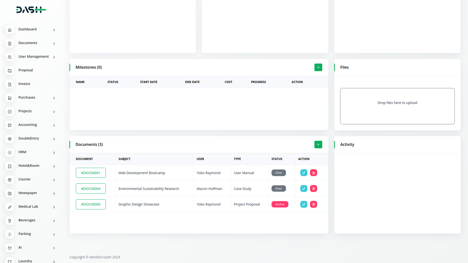 Experience the seamless integration of Dash SaaS's Documents Integration with the Project Module, revolutionizing project document management. Effortlessly link project-related documents, streamline collaboration, and enhance transparency within your project teams. With centralized document organization and project-centric features, empower your teams to achieve greater productivity and efficiency in project execution.